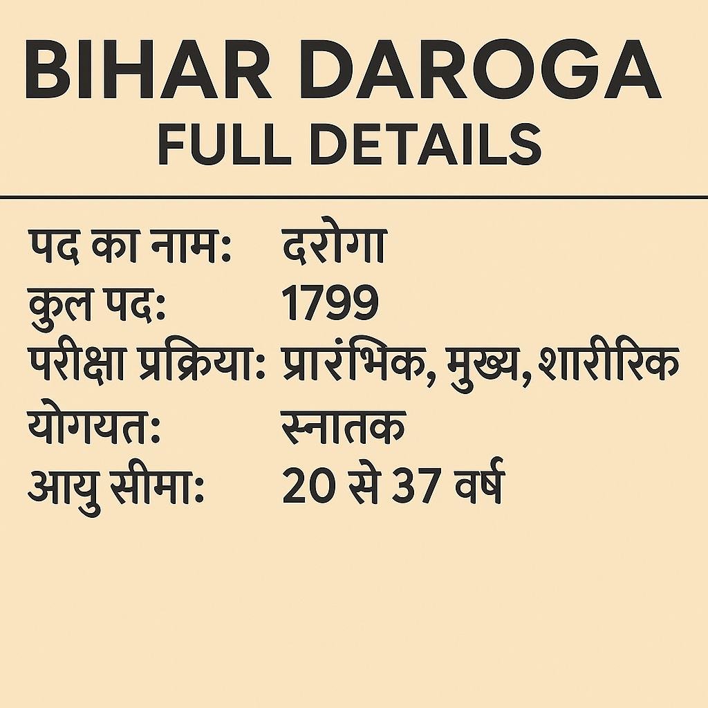 बिहार के युवाओं के लिए एक सुनहरा अवसर आया है। Bihar Police Sub-Inspector (Daroga) Bharti 2025 के लिए BPSSC (Bihar Police Subordinate Services Commission) ने अधिसूचना जारी की है। इस भर्ती के तहत योग्य उम्मीदवारों को दरोगा के पद पर नियुक्त किया जाएगा। इस लेख में हम आपको पात्रता, चयन प्रक्रिया, शारीरिक मानक, वेतनमान और आवेदन प्रक्रिया की पूरी जानकारी देंगे।